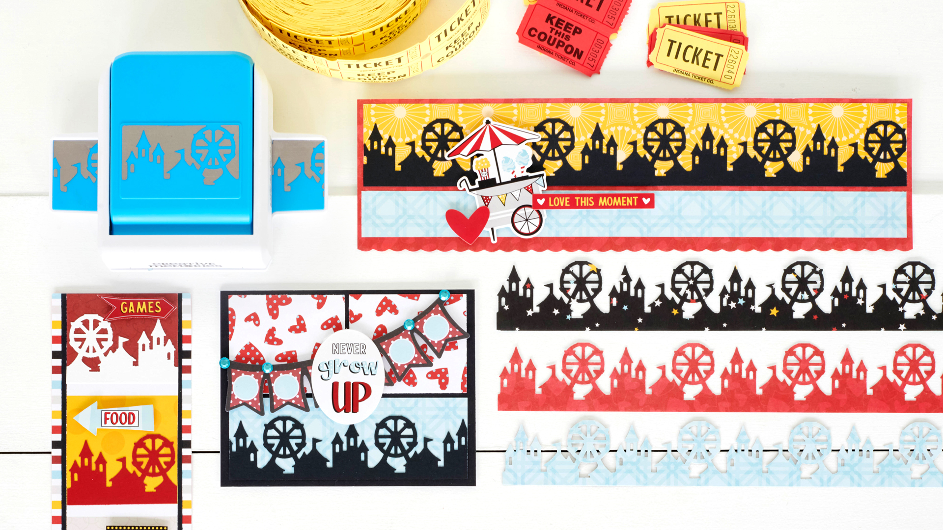 No matter if you have young kids or grandchildren or simply want a day of thrills and chills, an amusement park can bring out your inner kiddo and bring on the fun! Thrilling rollercoasters, spinning carousels, a bounty of arcade games — non-stop entertainment is always on the docket at these places of wonderland (and fun-derland)! Check out these crowd-pleasing amusement park crafts — two scrapbook borders and a DIY card — and make a beeline to your craft room to make them today!