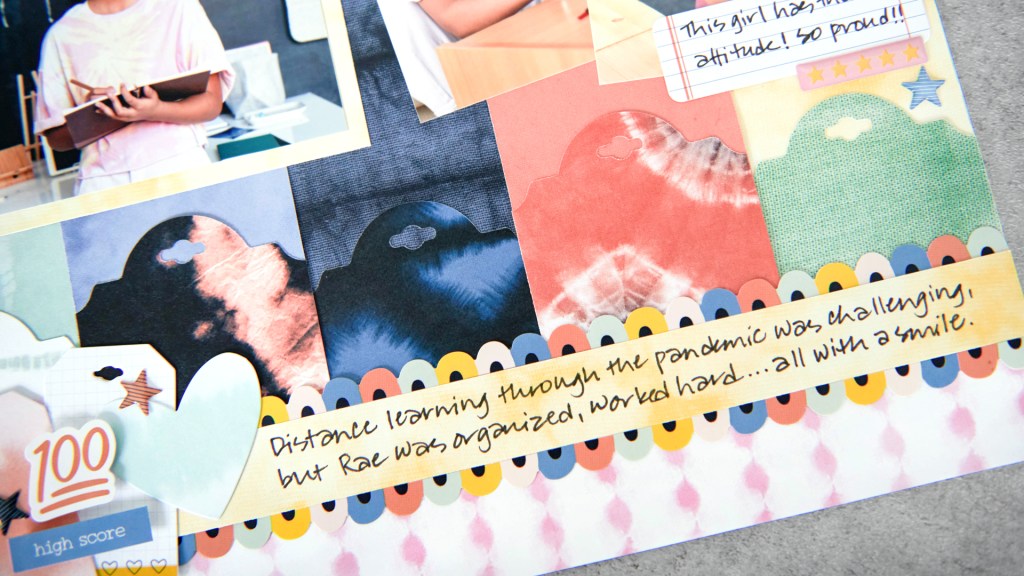 Many people have their own heartwarming, personal memories and flashbacks of school. From choir concerts to science fairs, adrenaline-filled sporting events and lunchtime hangouts with friends, there are so many wonderful events and activities to chronicle this passage of time. And when you add a bit of tie-dye flair and totally lit punched out labels to the mix, you get a trendy with tags scrapbook layout!