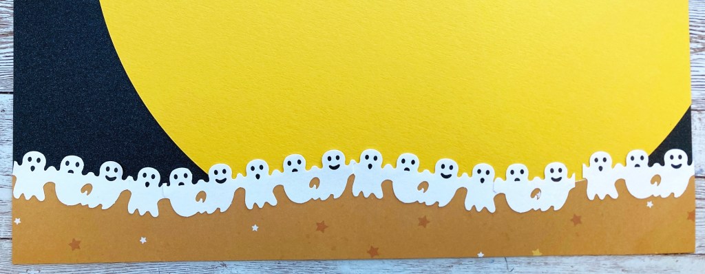 Step 5: Cut a slit between ghosts and bend it to form a wavy shape. Adhere the ghost border from the left side along the curvy piece. Cut the last three ghosts and add them to the right edge of the page as shown.