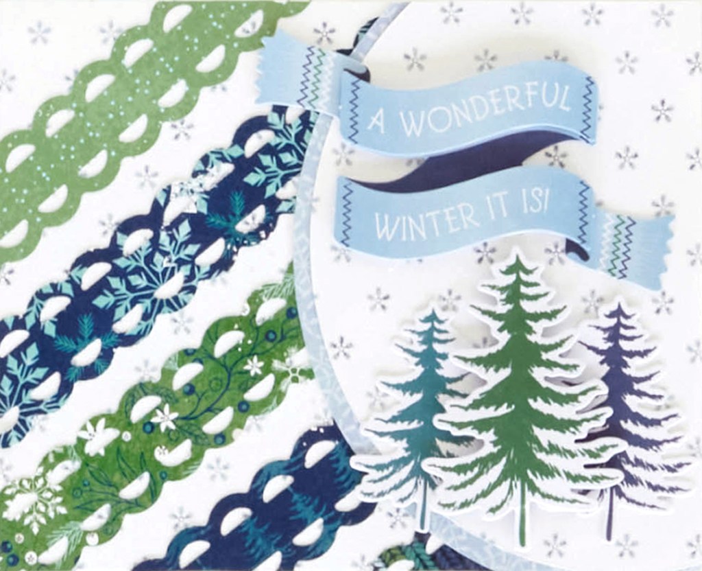 Step 1: Cut white dainty snowflakes paper to 5-1/2″ x 4-1/4″ and adhere to a blank card base.