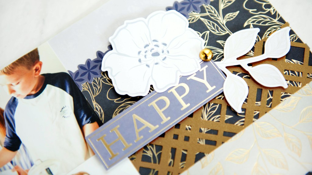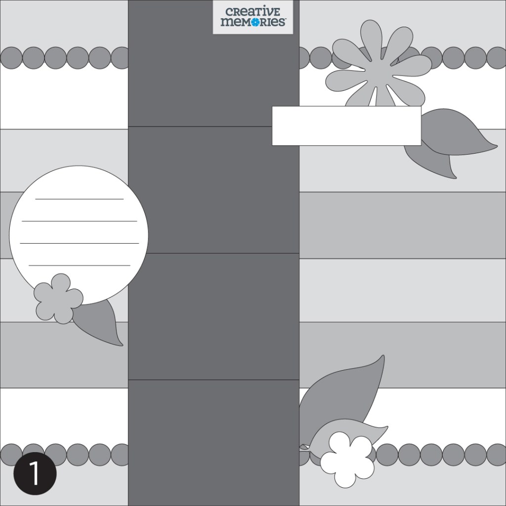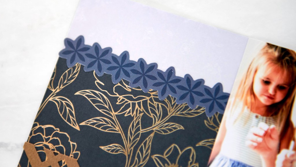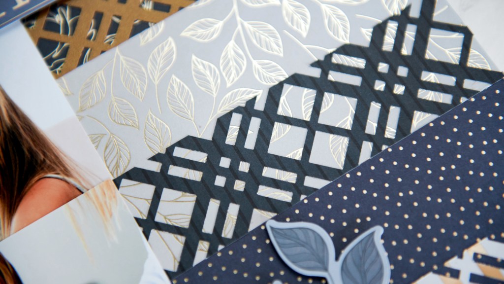 Step 3: From foiled confetti dots, champagne gold foiled leaves and navy foiled roses papers (or any 3 patterned papers), cut 12″ x 3″ strips. Or if you want more strips on your layout like shown in the sketch, cut (6) 12″ x 1-1/2″ strips.