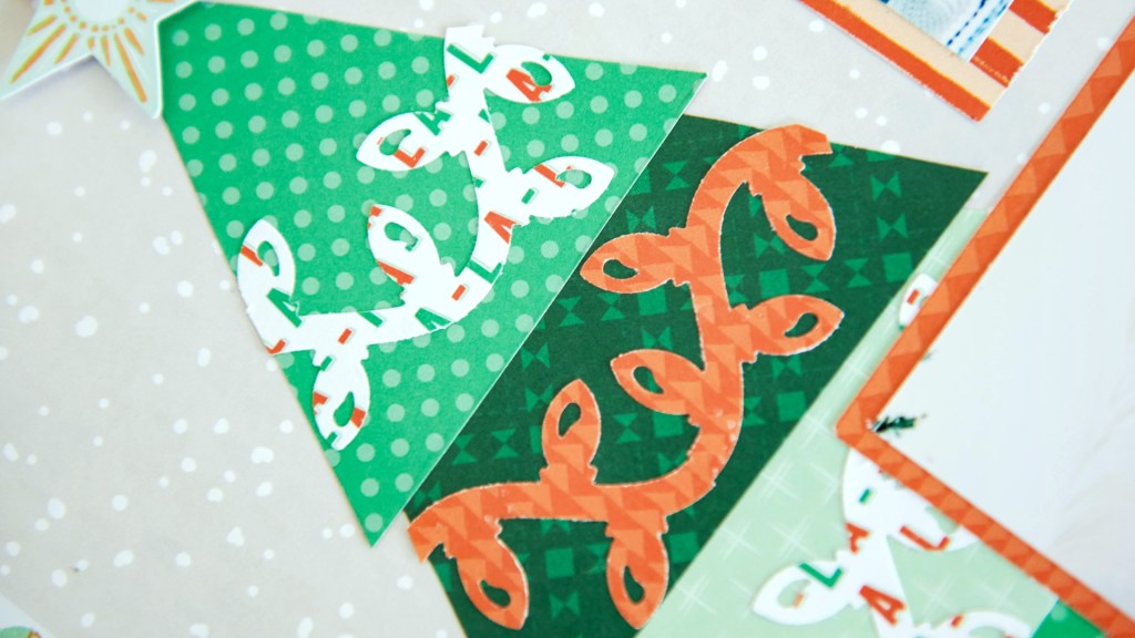 • Use the Twinkling Lights Border Punch, cut two borders with the “Fa-la-la-la-la-la-la-la-la” word art and tomato red triangles papers. Add to the top four sections of the tree and trim off any excess.