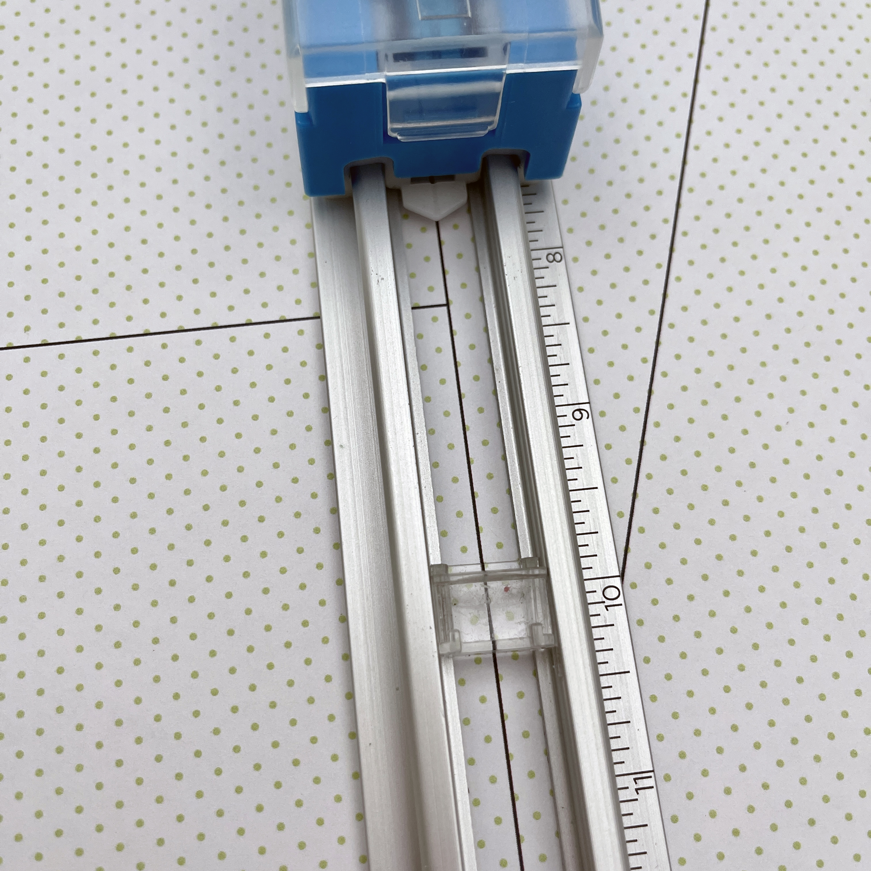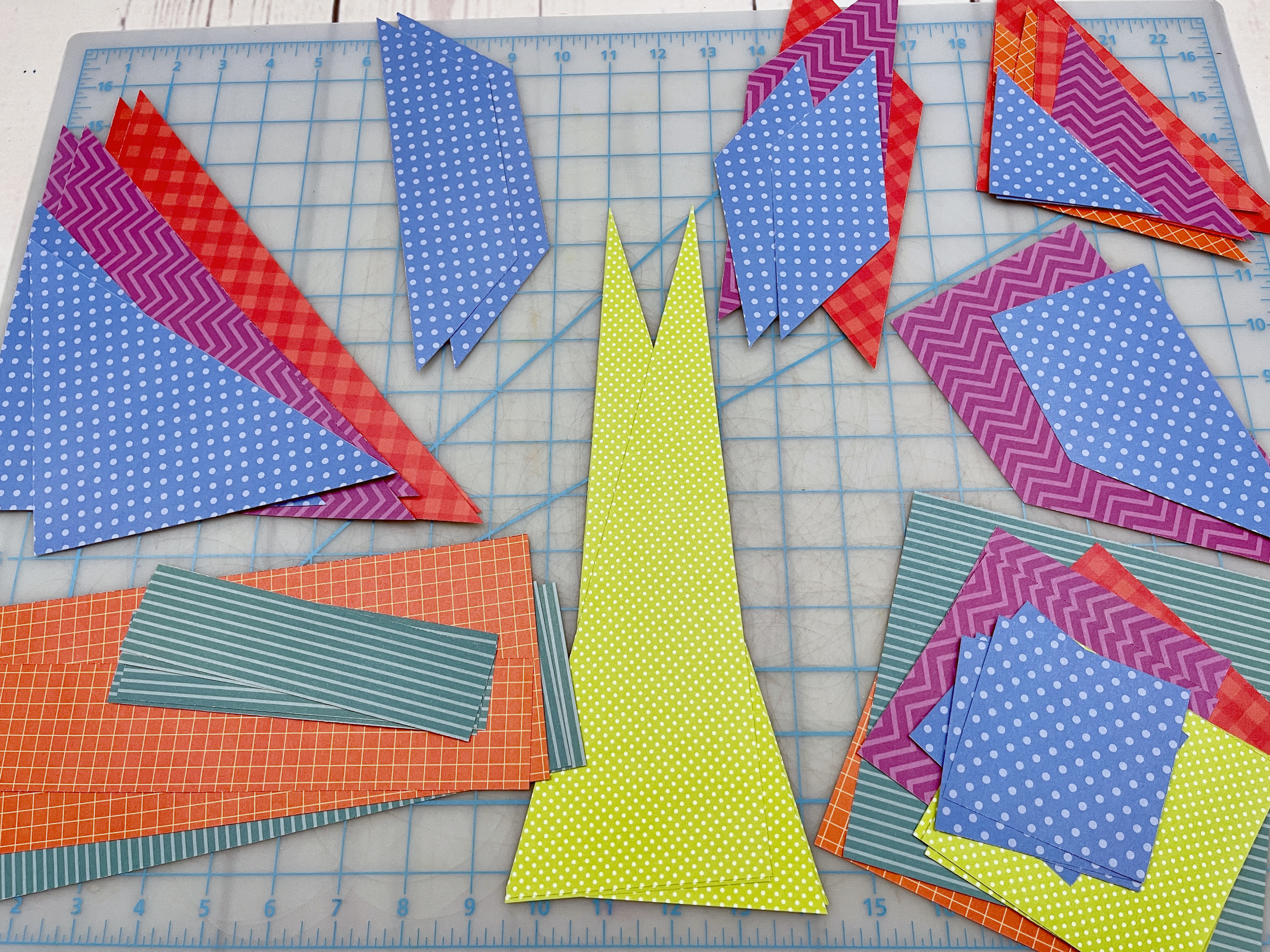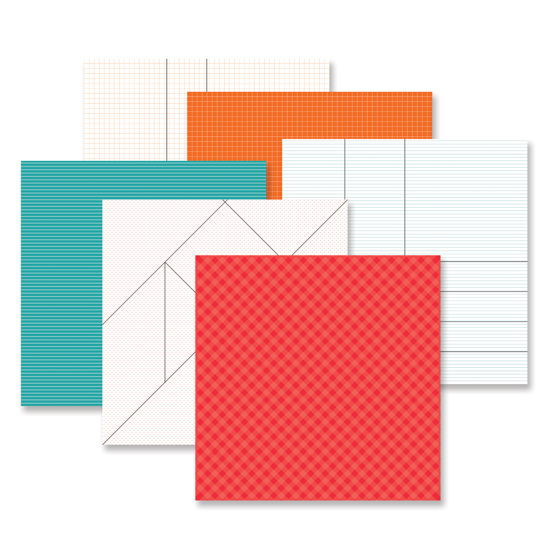 To have a plethora of Prismatic patterned paper pieces to play with, carefully cut along the lines printed on the back of each Prismatic paper. You can use the Sight Line guides on the 12-inch Trimmer to make sure you get the straightest cut possible! (Tip: Start by cutting straight-edged shapes on each paper first so when you need to make a diagonal cut you can easily turn the smaller pieces to fit in the trimmer.) After cutting out all the pieces, you can group them into piles with similar shapes or with similar hues.