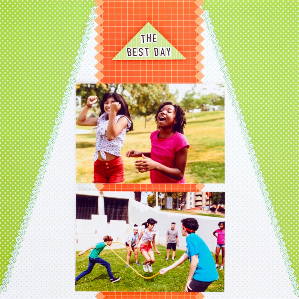 Step 2: Flip over two of the lime green polka dots triangles to show the reverse pattern. Adhere them on both sides of the orange grid strip as shown. Cover the seams between the triangles with coordinating green border stickers and along the sides of the orange grid strip with coordinating orange border stickers.