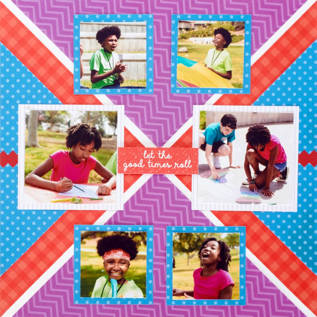 Step 4: Flip over the two purple squares to use as photo mats for two photos that measure 3-1/2″ x 3-1/2″. Adhere over the triangles and border sticker.