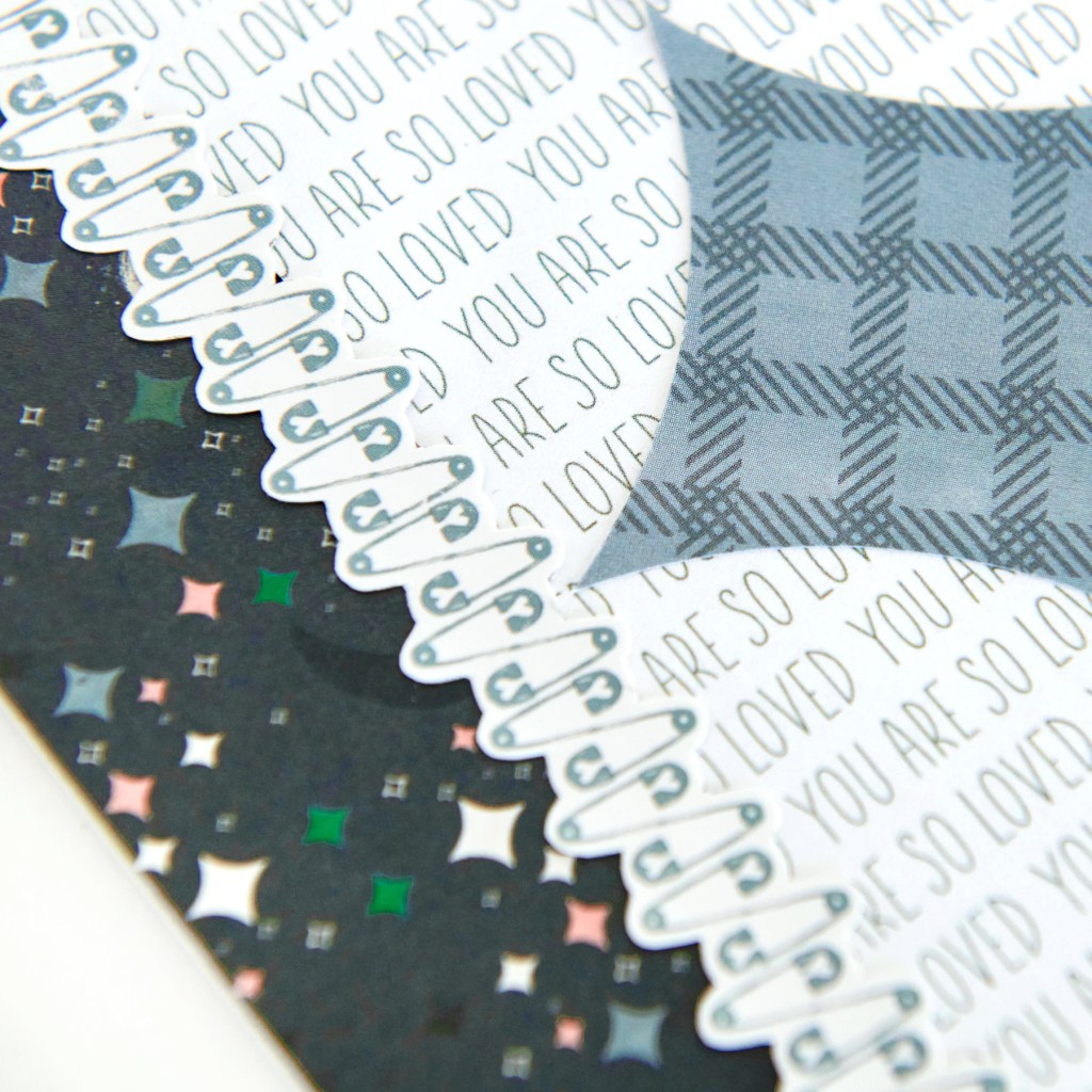 Step 2: Cut a 1-1/2″ x 12″ strip of night sky boy designer paper and adhere it to the left side of the left-hand page. Cut a 4-5/16″ x 12″ strip of “You are so loved” boy designer paper and adhere it next to the night sky strip on the left-hand page. Adhere a safety pins border sticker along the seam.
