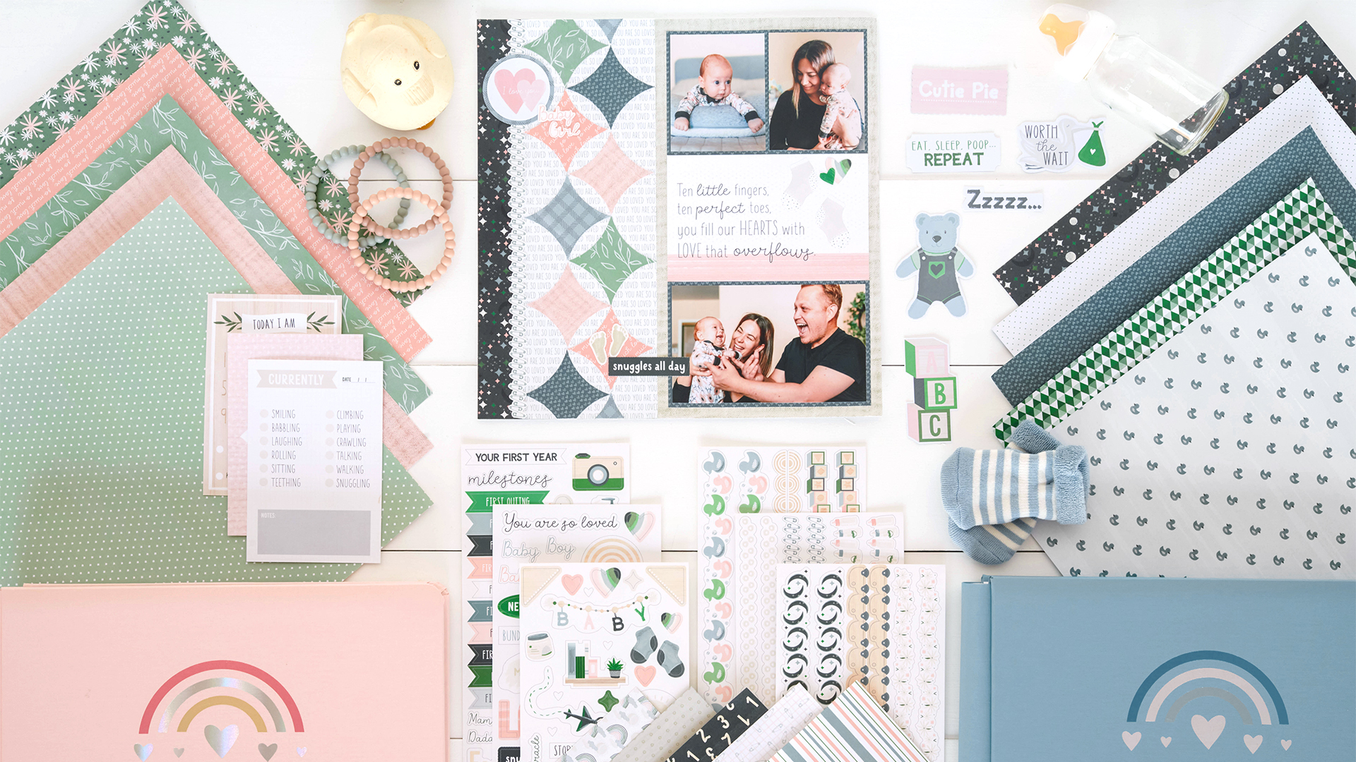 Our hearts are pitter-pattering and we’re cooing with delight — the latest collection, Lullaby Lane, is a complete bundle of joy! Inspired by the newest cute-as-a-button family member, these baby-themed scrapbooking supplies celebrate those big “firsts,” like first words and first tooth, as well as baby showers and baby announcements, cousin playdates, mealtime messes, splish-splashing fun in the bathtub and more. Swaddle your blissful baby beginnings with this two-page newborn scrapbook spread. (It’s pretty aww-dorable!)