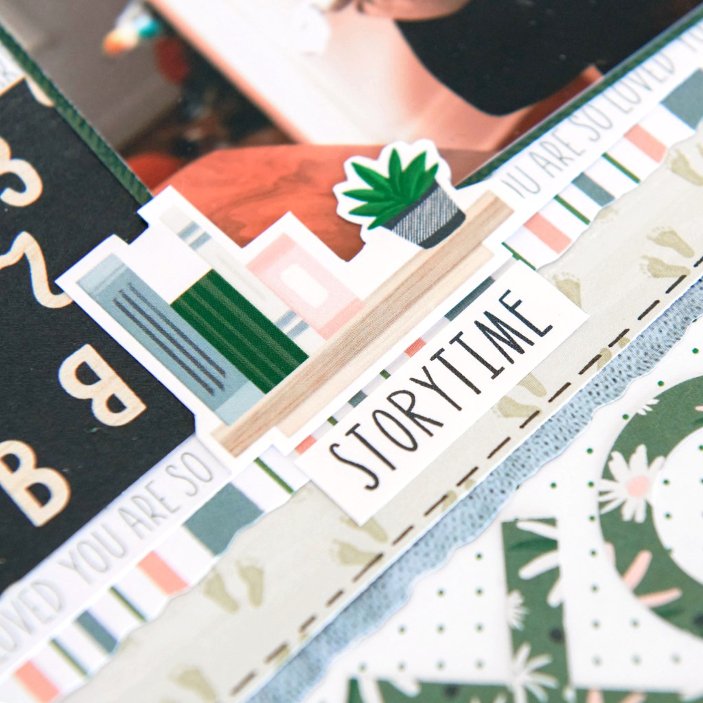 Long before babies understand a single word, most li’l ones love to hear their parents, grandparents and siblings (and really, anyone!) read out loud. Storytime combines soft snuggles, bright and eye-catching pictures, fascinating voices and sounds, and of course, you! It’s a sweet and relaxing way to bond with baby. As an added bonus, a 2019 study found that babies who are read to every day are exposed to 78,000 words each year (or by the time they reach the five-year-old mark, around 1.4 million words cumulatively from storytime!), which could mean a positive impact on their future language skills! Well, let’s get comfy and creative, for it’s time to button up your memories like a cute onesie and make this so-in-love infant scrapbook layout!