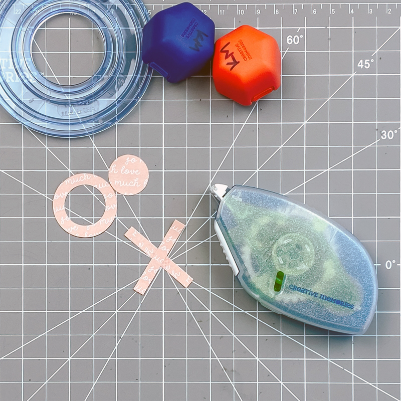 Step 4: Make Xs and Os from a variety of papers. Using the inside edge of the smallest Custom Cutting System Circle Pattern and the Blue Blade, cut a circle. Without moving the pattern, switch to the Red Blade and cut a circle. Repeat to make more Os. Cut 1-3/4″ x 1/4″ strips of the same papers. Arrange and adhere in X shapes. Place Xs and Os around the perimeter of the layout, 16 sets in all.