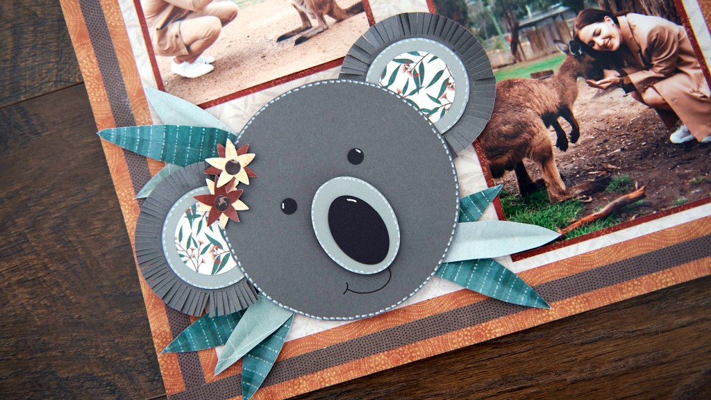 - Draw a mouth with a Black Dual-Tip Pen. Use the White Chalking Pen to highlight facial features and to add a stitched border around the koala’s head. Adhere on the layout with Foam Squares. Adhere the two remaining flower clusters to the koala’s left ear.