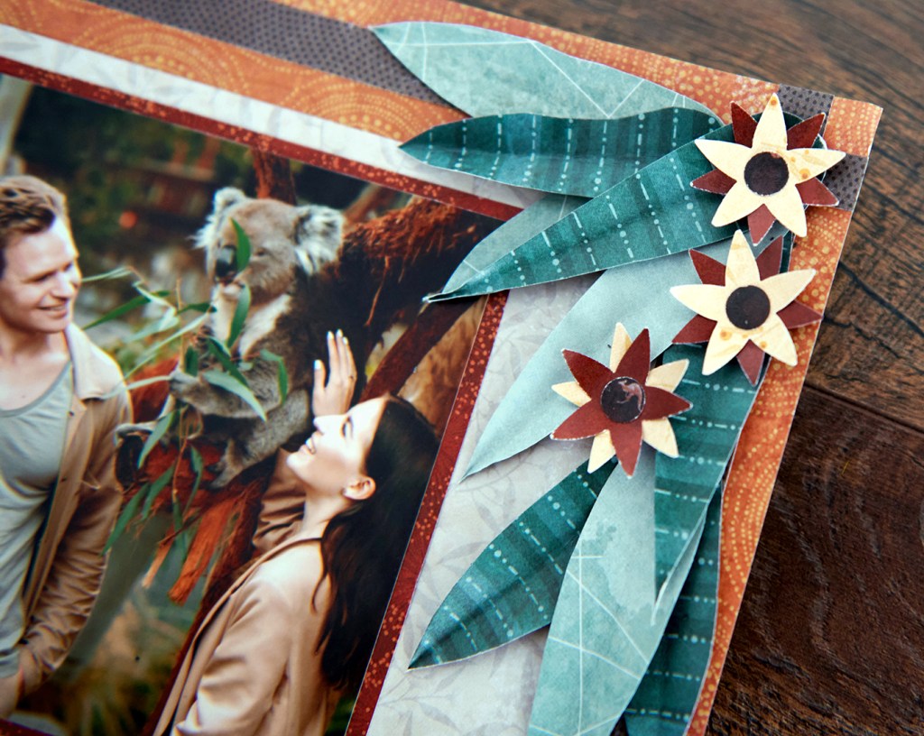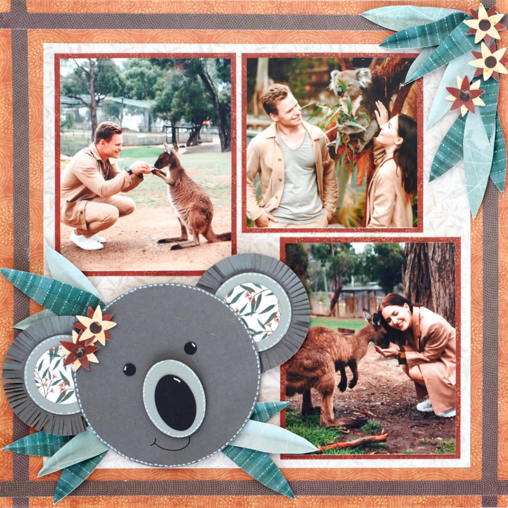 Think of Australia, and some symbols, images and icons may come to mind — the red, hot and dry Outback, the drone of a didgeridoo, unique wildlife like koalas, kangaroos, platypuses, echidnas and emus, the vast Great Barrier Reef, green-and-gold achievements in sporting arenas and much more. And when you pair these sentiments with the latest Sunburnt Country Paper Pack (and the fact that the 26th of January is Australia Day!), you’re in for layouts that are astoundingly Aussie, like this Australia scrapbooking layout that is definitely high in koala-ty!