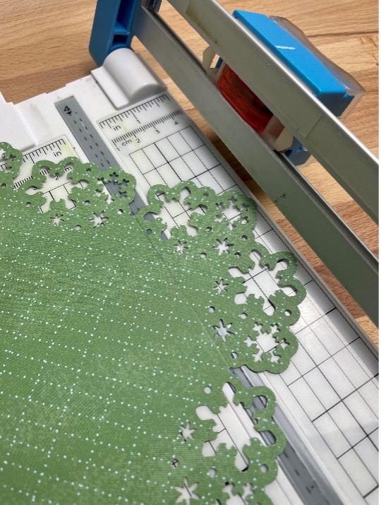 Step 6: Draw a line across the corner of the punched area, then score with 12-inch Trimmer and Scoring Blade. Fold over and adhere the corners back as shown.