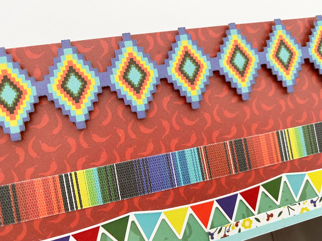 Step 2: Adhere one of the flags banner border stickers to the base of the top red chili peppers strip. Use small Foam Squares to adhere the diamond-shape blanket pattern laser-cut border to the top of the page.