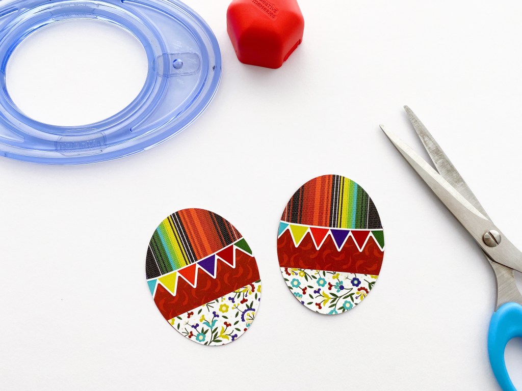 Step 4: From the red chili peppers/serape stripes paper, cut three ovals using the inside edge of the second-largest Custom Cutting System Oval Pattern and Red Blade. From the floral paper, cut one oval the same size. Using a scissors, cut the top and bottom from one of the ovals on the serape stripes side and adhere each of them to the top of the two ovals, with red chili peppers side facing up. Cut the top and bottom from the remaining floral oval and adhere both to the bottom of the red ovals. Add a decorative edge by adhering the flag banner border sticker and trimming away any excess.