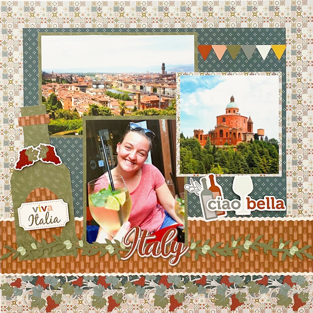 I fell instantly in love with the palette and designs of the papers in the Italy Theme Pack. They reminded me of the hues of terracotta cobblestones and the designs in nonna’s patchwork quilts, as well as rolling hills in a picturesque landscape featuring many scattered wineries. Italy produces more wine than any other nation in the world, and I knew this collection would be perfect to capture some food and wine tour memories.
