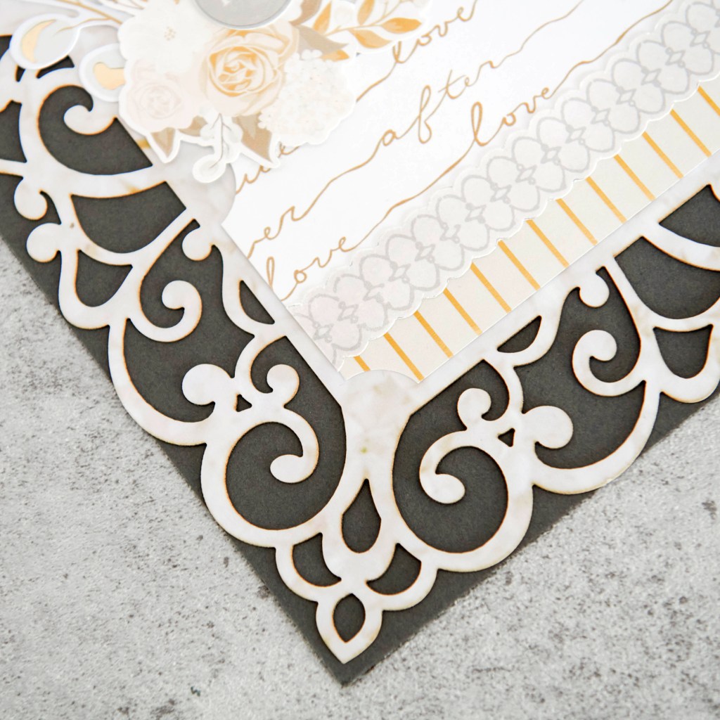 Wedding photography allows you and your spouse to relive the entire day, from the excited morning preparations and makeup sessions, all the way to the late-night toasts with clinking champagne flutes. But when the dress has been put away, the caterer has left the venue and the emotional tears and happy laughing of friends, family and colleagues are now cherished snippets in time, it’s the photos that remain. Capture blissful beginnings as one by creating this framing wedding scrapbook layout with intricate, laser-cut details!