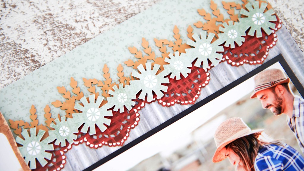 Step 10: Adhere wheat stalks laser-cut border along the top edge of the seam between the light teal dainty floral and corrugated tin pieces. Adhere the red bandana laser-cut border along the bottom edge of that seam. Adhere the metal windmill blades laser-cut border over the top of that seam using Foam Squares.