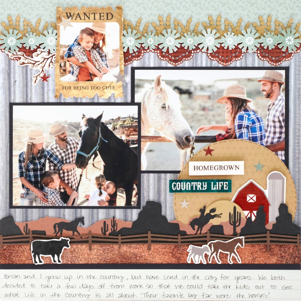 Lush acreage, fresh air, seeing more stars, open country skies… yep, SOLD, on rural life! And if you’re sold on anything regarding corralling and riding horses, camping, nights around a bonfire, harvesting fruits and veggies at a farm and anything that exudes country charm, then this is the project for you! Take a look for yourself with this country scrapbook idea!