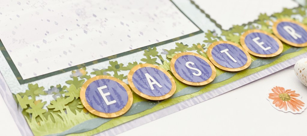 The pastel tones and floral themes of the Endless Meadows collection were the driving inspiration for my Easter-themed layout. They had me envisioning rolling meadows with the scent of fresh flowerbeds and cute little bunnies hopping by! I wanted to create a page that would help document my beloved Easter egg hunt or spring memories.