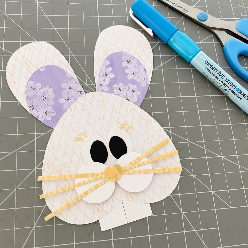 - From White Solid Cardstock trim a strip of paper to measure 3/4″ wide and from that trim two pieces to measure 1-1/2″ long. Adhere these as “teeth” to the bottom-middle of the curve for the bunny’s head.