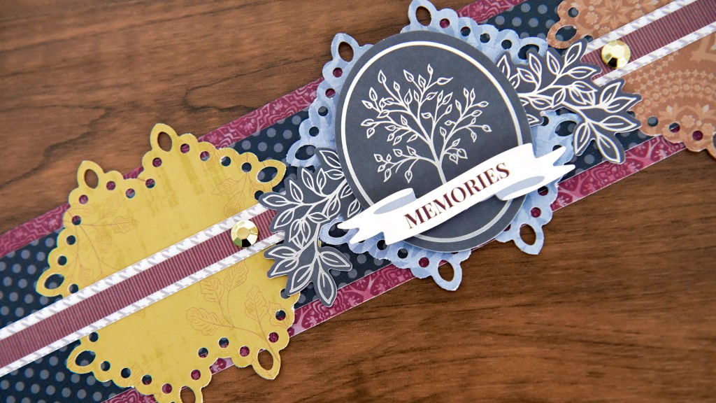 Step 6: Cut two pieces of maroon vintage foliage tonal paper to measure 1/2″ x 5-1/4″. Adhere along the previous mustard ornate damask pieces.