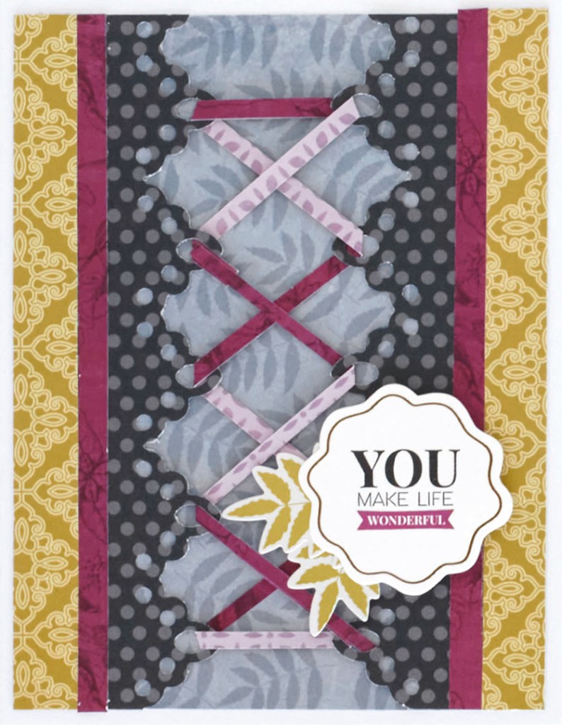 Step 4: Cut two pieces of maroon vintage foliage tonal paper to measure 12″ x 1/8″. Glue ends together using Precision Point Adhesive Pen. Use this piece to lace through the arches as shown.