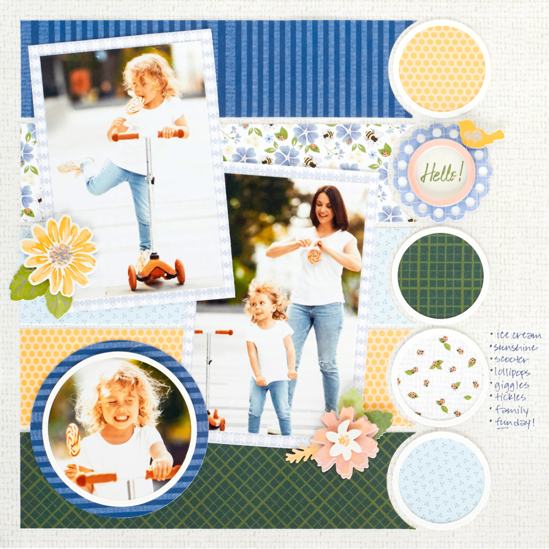 Step 3: Using the inside edge of the medium Custom Cutting System Circle Pattern and the Green Blade, cut circles with golden yellow honeycomb, green plaid, scattered ladybugs and light blue triangles papers. Adhere to the layout as shown. Using the inside edge of the medium Custom Cutting System Circle Pattern and first the Blue Blade, then the Green Blade, cut four rings with White Solid Cardstock. Adhere the circles and rings together.