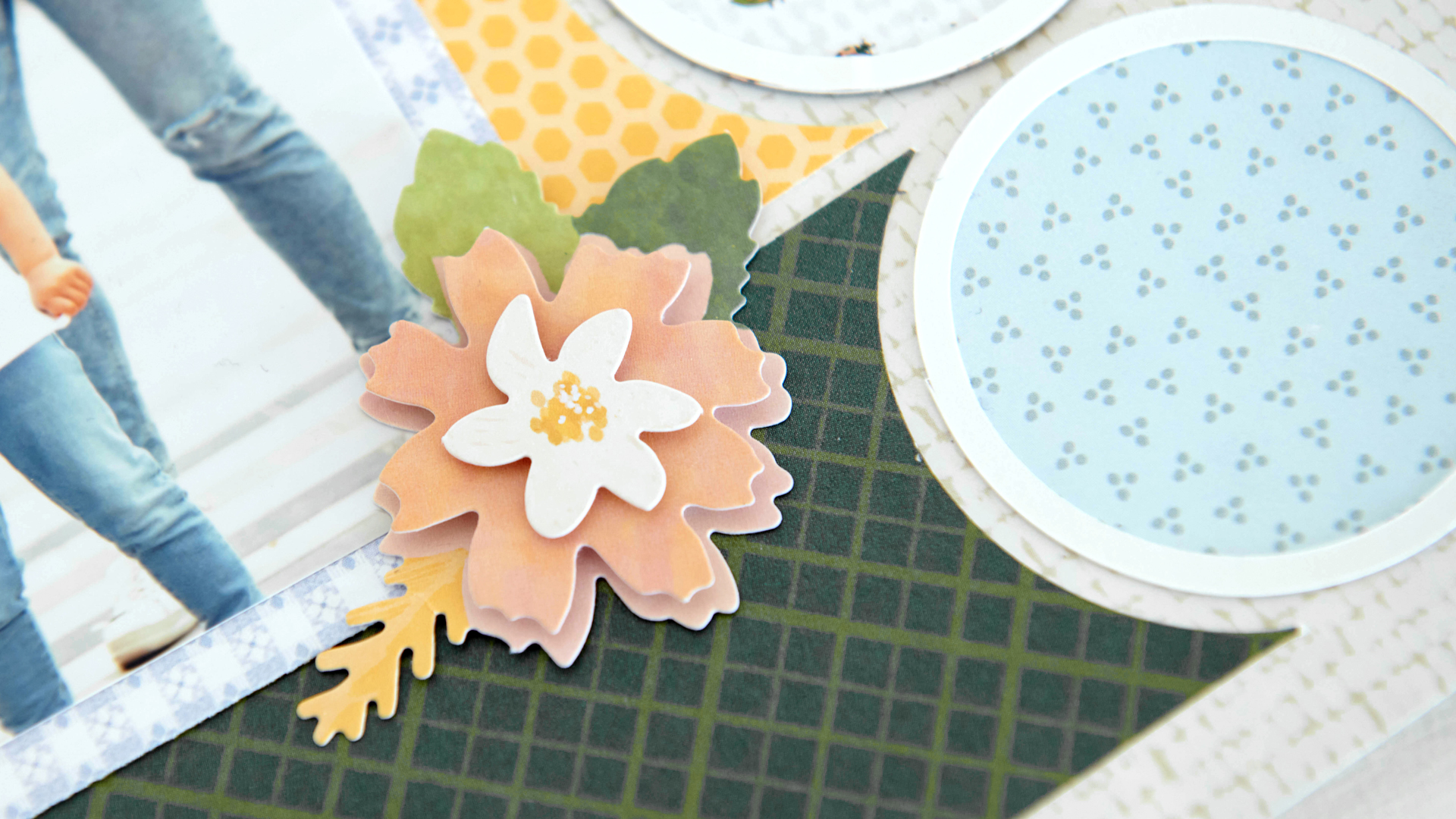 Step 2: Cut 8-3/4″ x 2-1/8″ strips with blue stripes, bees and florals, golden yellow honeycomb and green plaid papers. Using the inside edge of the medium Custom Cutting System Circle Pattern and the Red Blade, cut a circle off of just one end of each piece. Adhere to the layout, spacing evenly and leaving a 1/2″ edge around three sides.