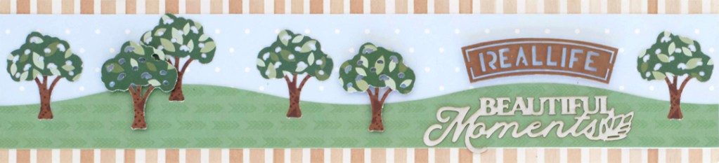 Step 3: Using the Oak Tree Punch, punch three trees from wood grain designer paper and three from leaves texture paper. Trim out the foliage from the green trees and mount on the brown trees. Adhere to the corner with Foam Squares along with a sticker title.