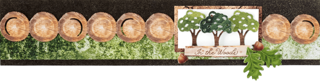 Step 3: Cut a 2-1/8″ x 10-3/8″ strip of White Solid Cardstock and adhere to the border. Cut three 2″ squares of wooden cabin texture and two 2″ squares of leaves texture paper. Using the Oak Tree Punch, punch once in the middle of each square. Adhere the squares to the border, leaving a slight space between as shown.