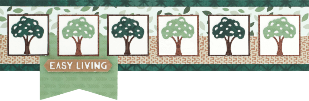 Step 2: Cut six 1-1/2″ squares of Light Gray Solid Cardstock. Cut six 1-1/4″ squares of various papers (wood grain, marbled wood, pines) and mount on top. Using the Oak Tree Punch, punch six trees and adhere to the tops of the squares. Mount on the border.