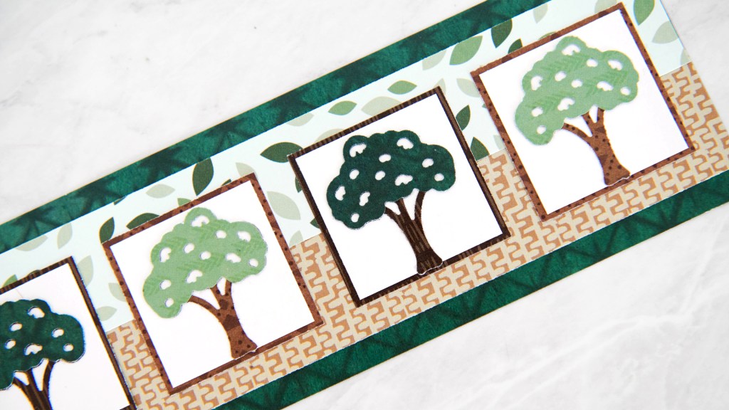 Step 1: Cut a 12″ x 2-1/2″ strip of dark moss designer paper for the base. Cut a 12″ x 1-1/4″ strip of green abstraction designer paper and mount on the base. Adhere a tree rings laser-cut border.
