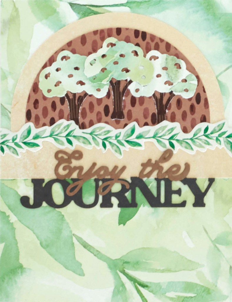 Step 5: Cut a 4-1/4″ section of Green Hues leaves border sticker and adhere on the card. Adhere the “Enjoy the journey” laser title embellishment with the Precision Point Adhesive Pen.