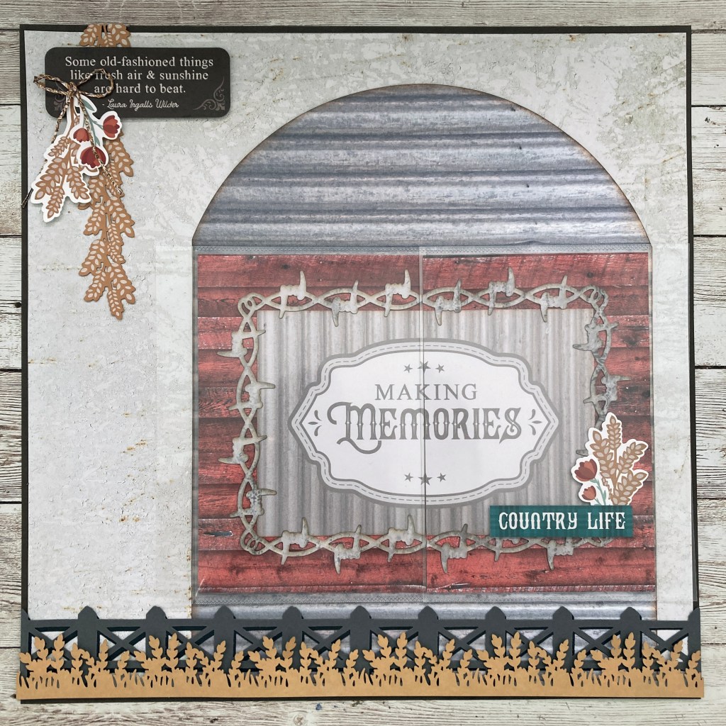 Step 3: Cut a piece of red barn wood texture paper to 8″ x 6″ for a mat. Add the “Making memories” variety mat and the barbed wire laser-cut mat, and then cut in half. For the backside of the red barn wood texture mat, cut out the panel from the variety mat. Add stickers and inset the mats to Peekaboo Pockets™.