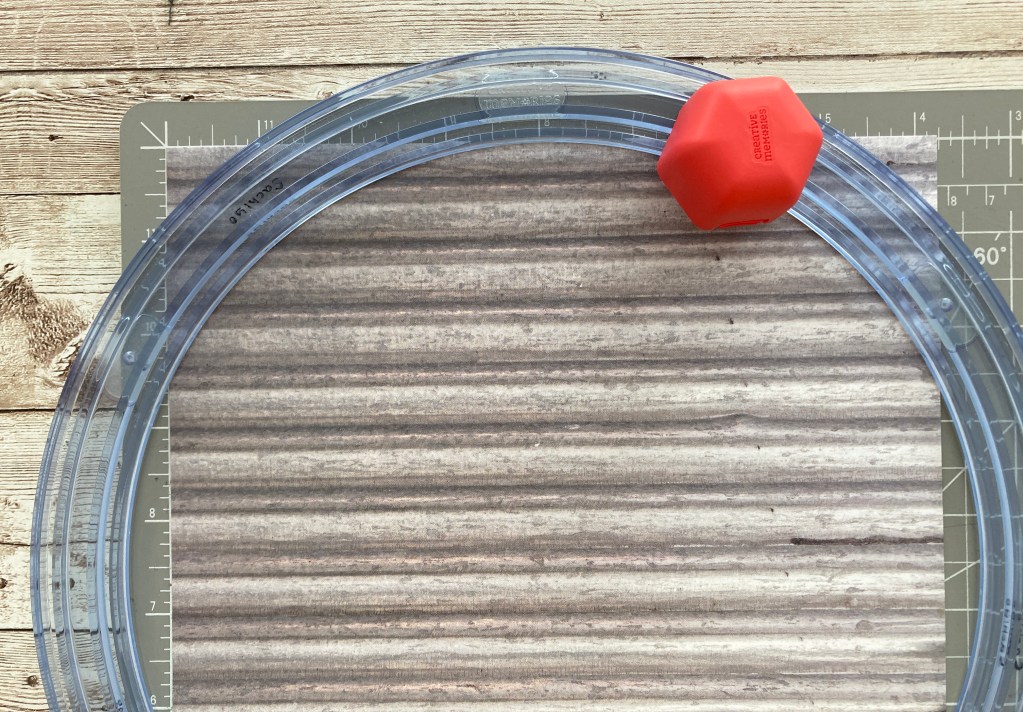Step 2: Cut a piece of corrugated tin texture paper to measure 8-1/4″ x 11″. With the inside edge of the Jumbo Custom Cutting System Circle Pattern and the Red Blade, cut the top as shown. Use the Brown Dual-Tip Pen to ink the edges. Adhere to the layout.