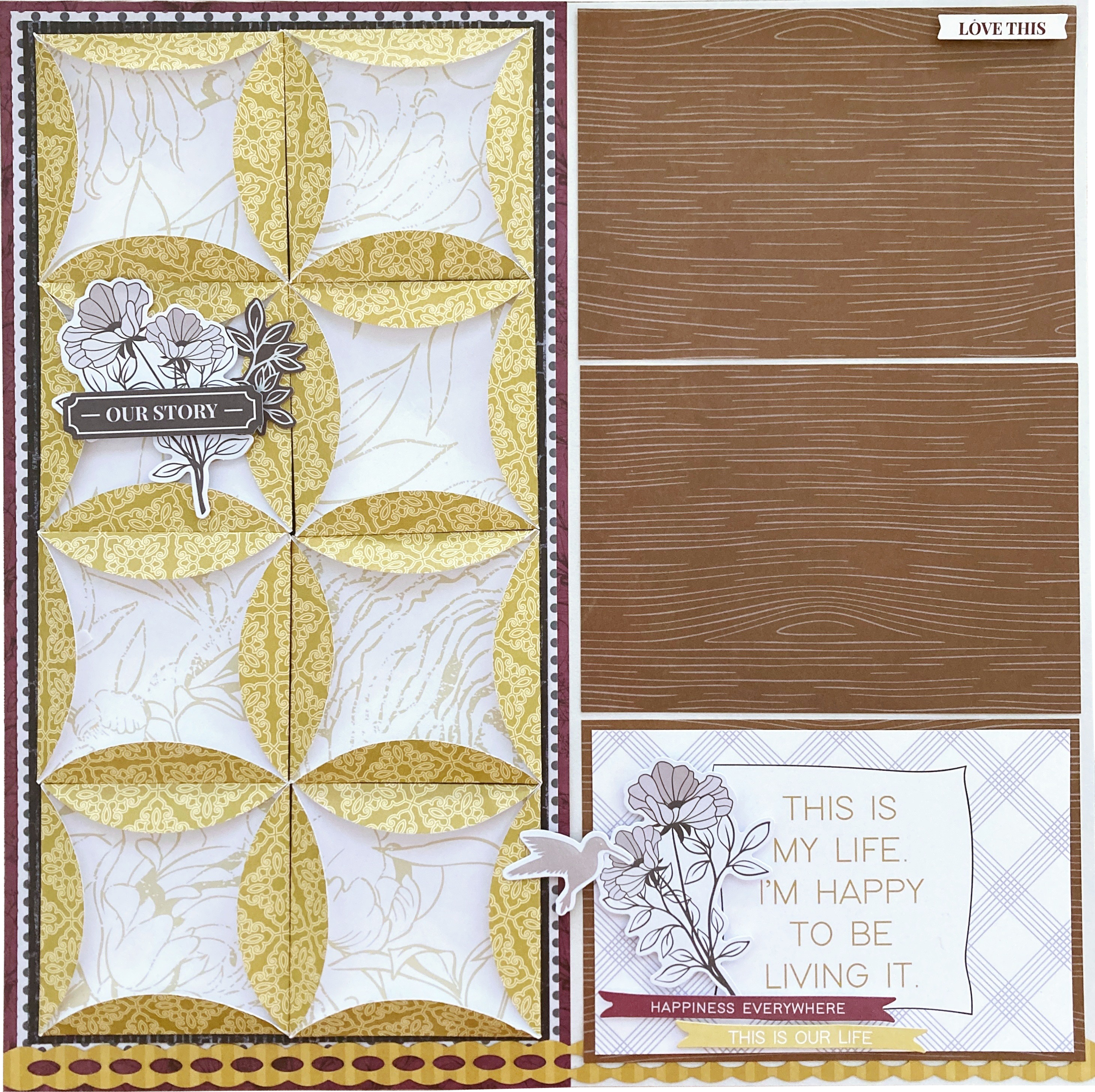 Step 6: Cut three mats from the umber woodgrain tonal paper to measure 3-3/4″ x 5-1/2″. Cut a “This is my life. I’m happy to be living it.” mat to measure 3-1/2″ x 5-1/4″ and adhere to one of the umber woodgrain mats. Add these mats to the page.