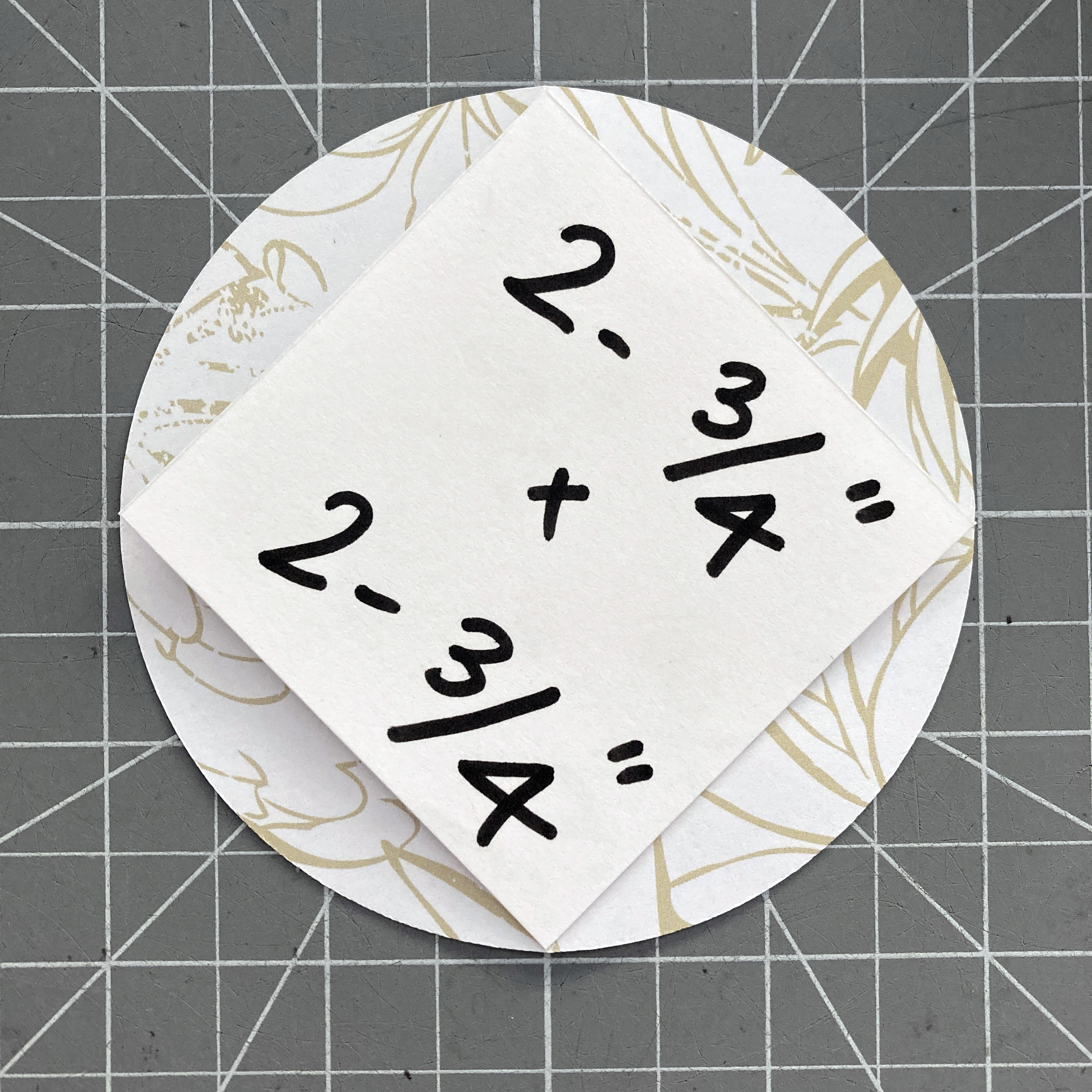 Step 3: Cut a piece of any cardstock to measure 2-3/4″ x 2-3/4″. Use this as a template to fold circles. Fold a circle in half to find the midway points. Place the square template on the midway points as shown. Fold the circle along the template. Repeat to fold the other seven circles.
