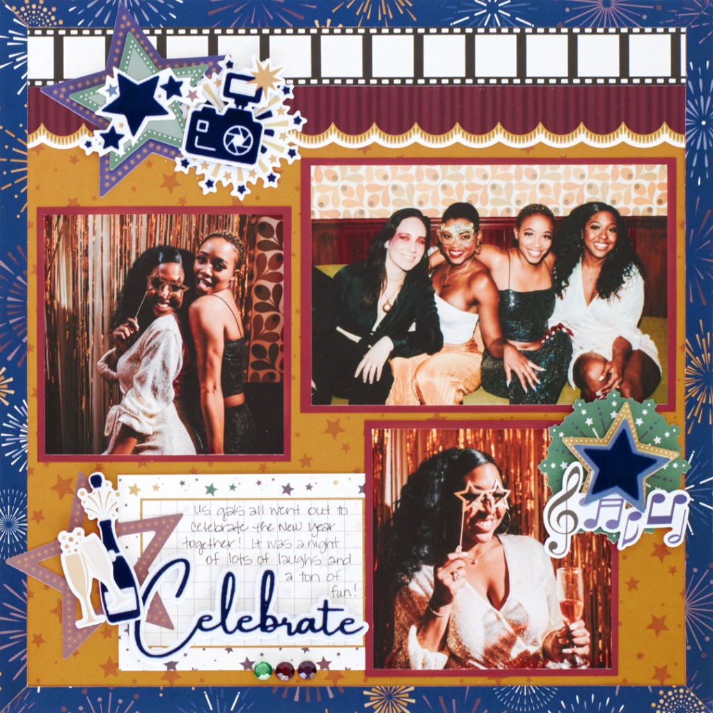 We’re not just randomly stating these words and phrases… we’re all about your star status moments, for the Showtime collection is now in the spotlight! What’s this dressed to the nines collection all about? Special moments like charity balls or galas, prom, attending a play, opera or symphony, glitzy parties, band recitals, talent shows and more — those pictures and memories that are worth a round of applause! See for yourself with this red carpet themed scrapbook layout!