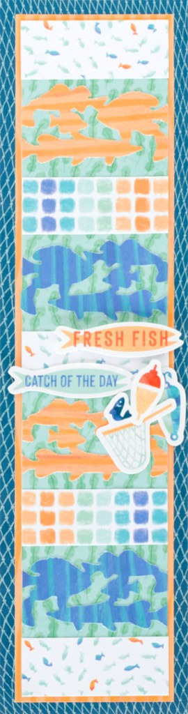 Step 1: Cut a 12″ x 3-1/8″ strip of fishing net designer paper for the base. Cut a 2-3/4″ x 11-1/2″ strip of soft medium orange stripes designer paper and adhere on the border. Cut a 2-1/2″ x 11-1/4″ strip of mint seaweed designer paper and mount on top.