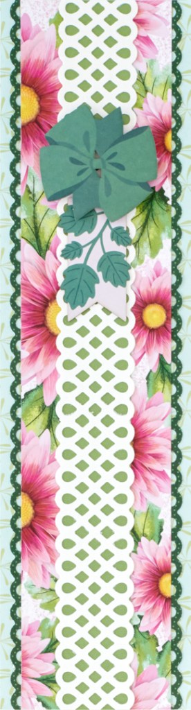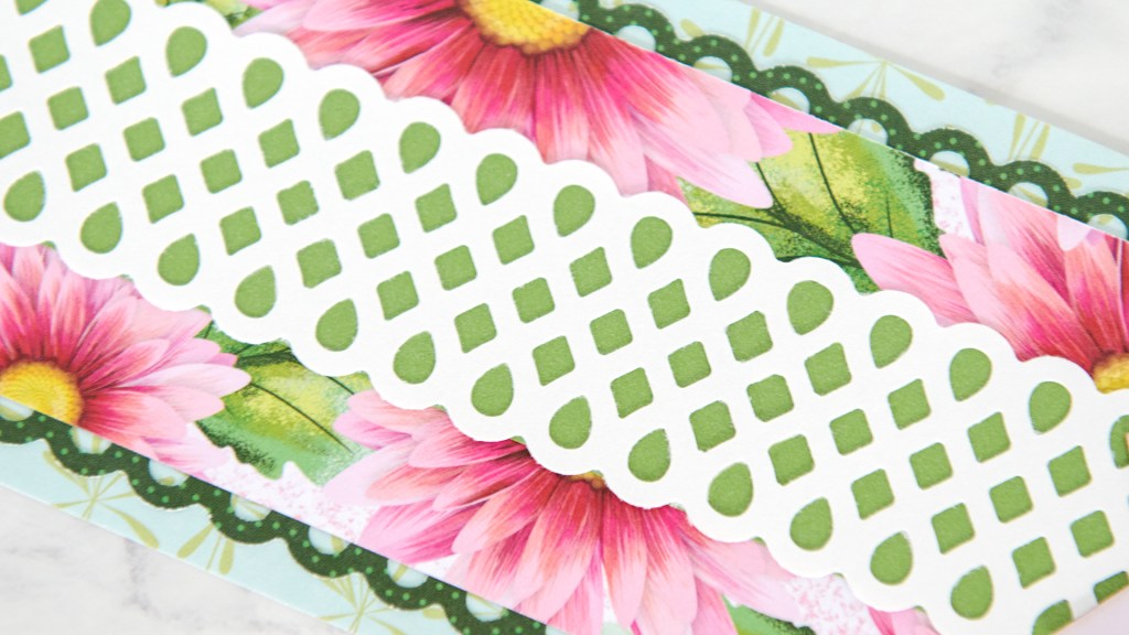 Step 2: Cut a 2-1/2″ x 12″ strip with jazzberry bold chrysanthemums paper. Using the Teardrop Lattice Border Punch, punch a border with lime tart dotted scallops paper. Cut in half lengthwise. Adhere behind the bold chrysanthemums strip as shown. Mount on the base.