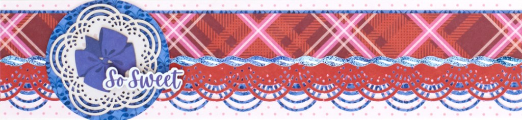 Step 3: Cut a 12” x 1-1/8” strip with jazzberry plaid paper and adhere on the border as shown. Place a ribbon border sticker along the seam.