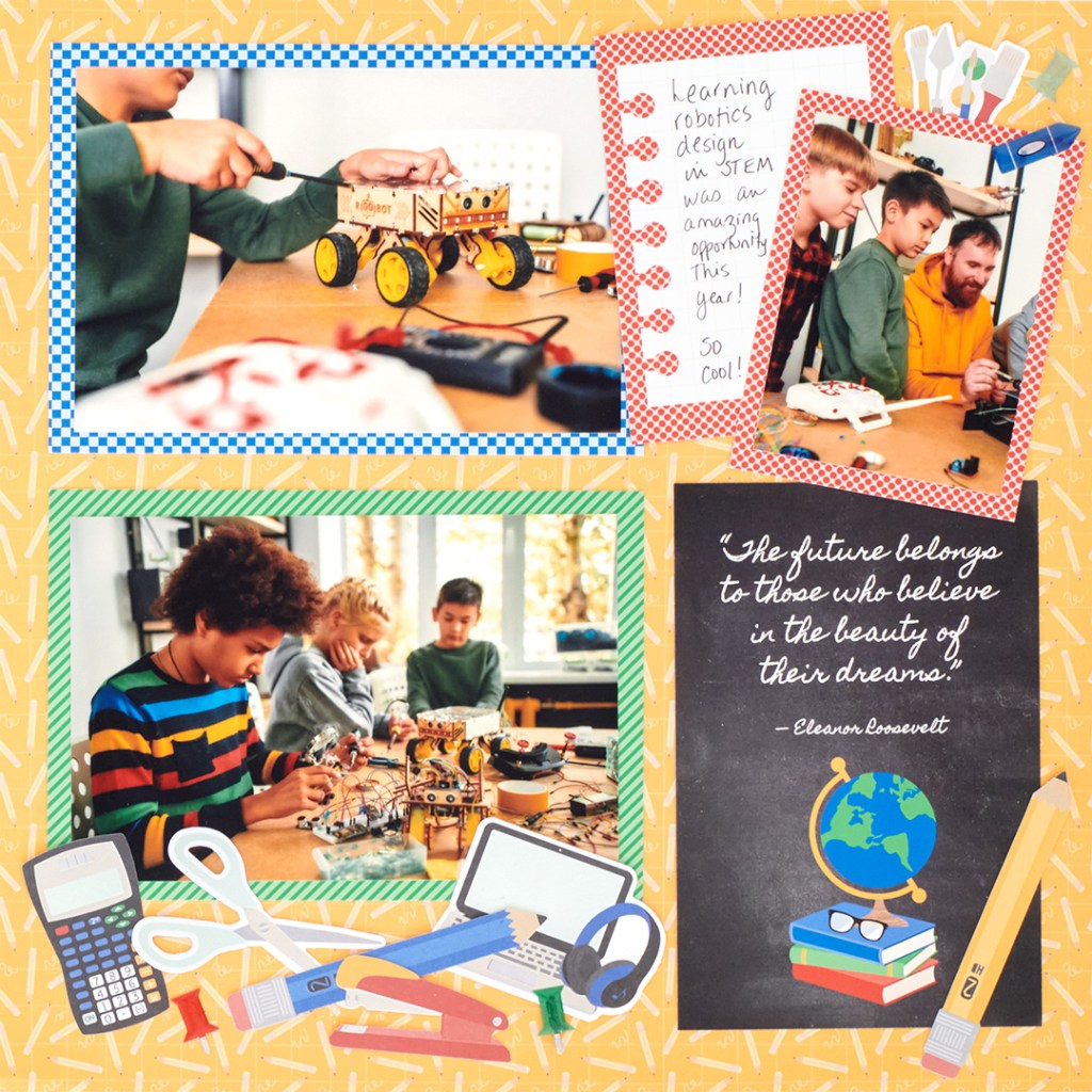 Everyone has a beloved subject in school, whether it’s a STEM course (science, technology, engineering and math) or something more along the lines of the arts and language, there’s so much to learn out there in the world! Well today, it’s time to put on your thinking cap and put your nose to the grindstone, for we’re putting you to the test with this school themed scrapbook layout.