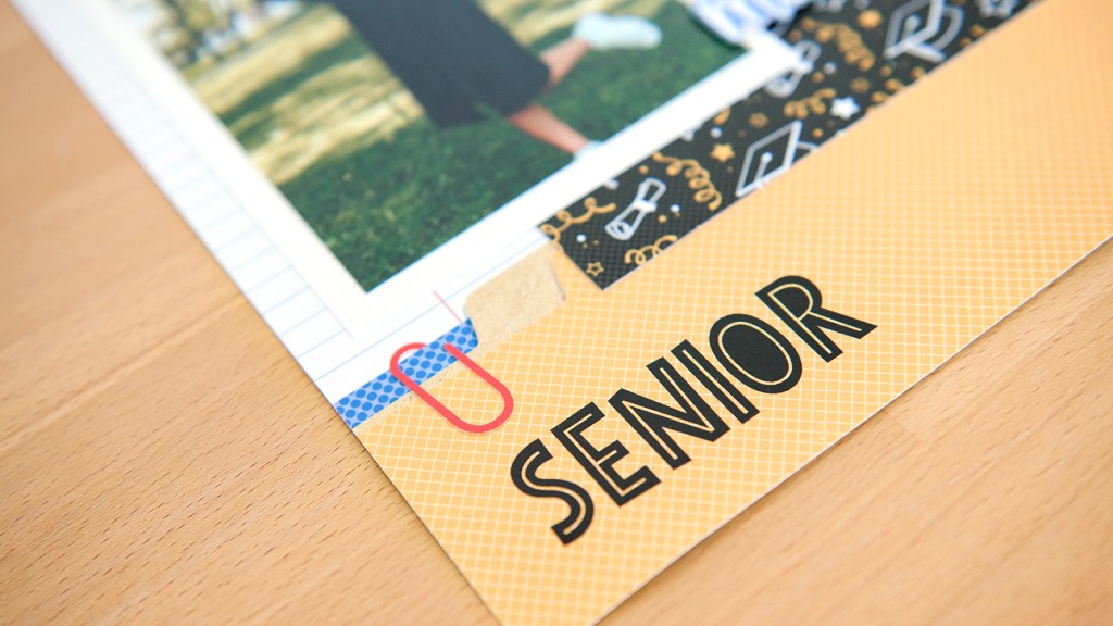 Step 1: Use the senior annual paper for the left-hand base page and the black graduation caps and diplomas annual paper for the right-hand base page.
