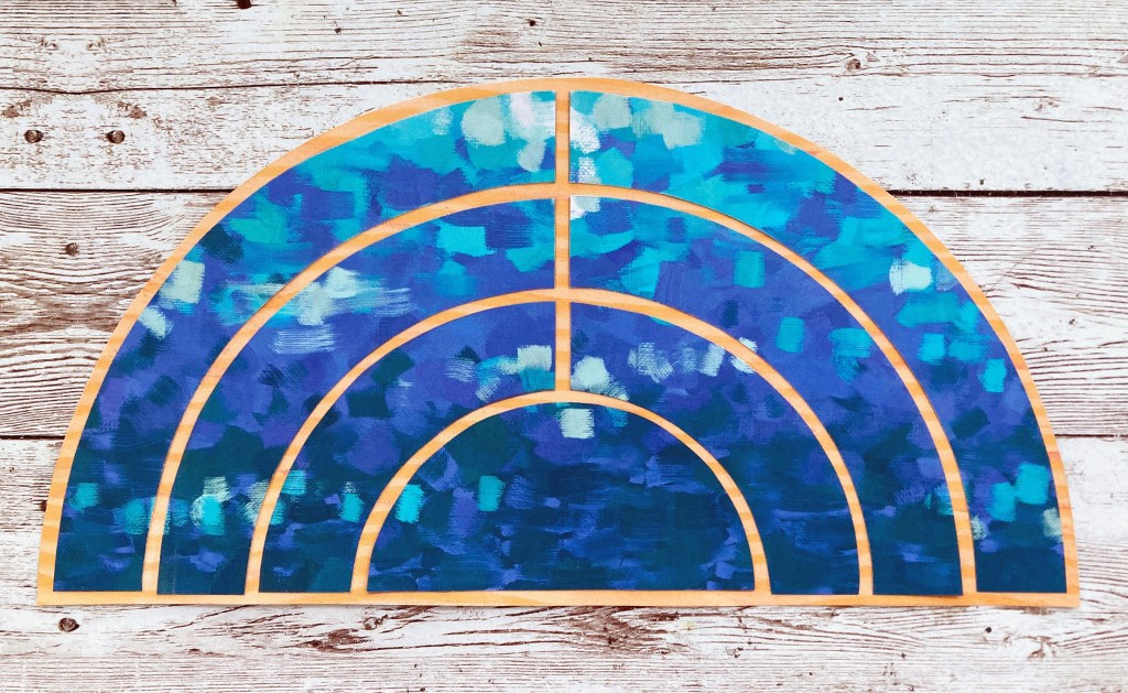 Step 2: Use the Sunrise, Sunset Recipe Template to trace the following half-circle section on the warm stripes designer paper. Cut out the traced piece as shown. Use the Sunrise, Sunset Recipe Template to trace sections on the blue part of the abstract painterly brushstrokes designer paper (the first half circle and the following three half-rings). Cut out the traced pieces and add to the warm stripes piece as shown. Add to the page.