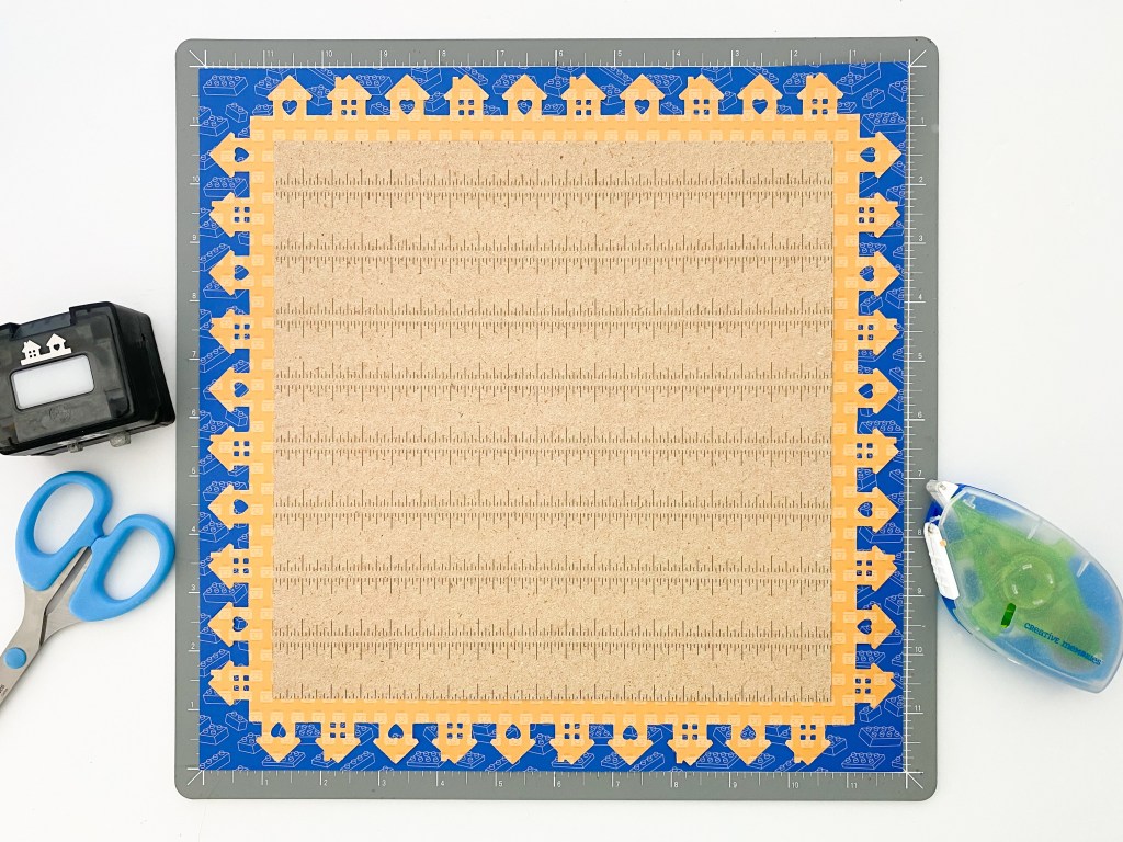 Step 2: Align and adhere this over a contrasting piece of 12×12 designer paper with Repositionable Tape Runner. Trim a third contrasting piece of paper to measure 9-1/2″ x 9-1/2″ and adhere to the middle to create a homes frame. (To conserve paper, you can remove the middle from the bottom two pieces of paper first.)