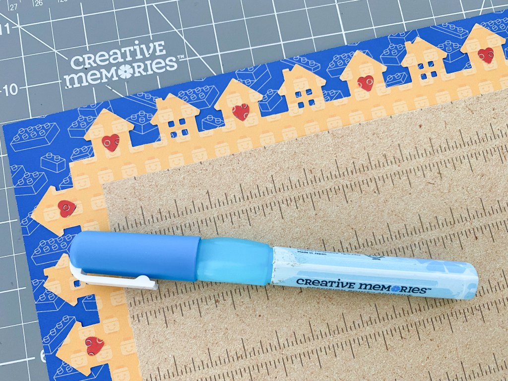 Step 1: Using the Original Border Maker System with the Home Sweet Home Border Maker Cartridge, punch all four sides of a piece of designer paper. Keep all the small punched-out hearts. (Tip: Punch the top and bottom edges first, followed by the remaining two sides.)