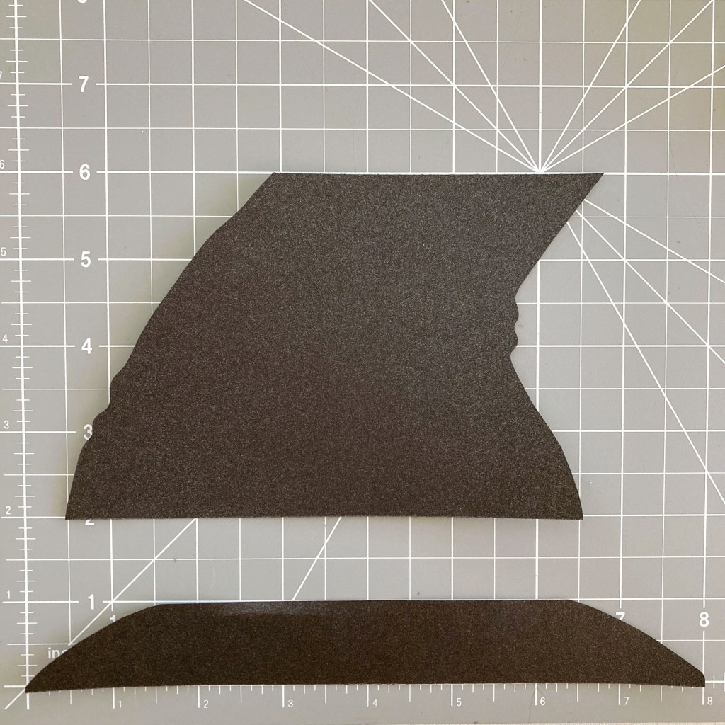 Step 3: Cut a piece of Black Shimmer Solid Cardstock to measure 1″ x 8″ and 7″ x 4″. Draw a hat brim and hat freehand. Cut along the line. Cut a piece of Pumpkin Solid Cardstock to 1/2″ width and add between the hat brim and hat. Trim the excess with scissors.