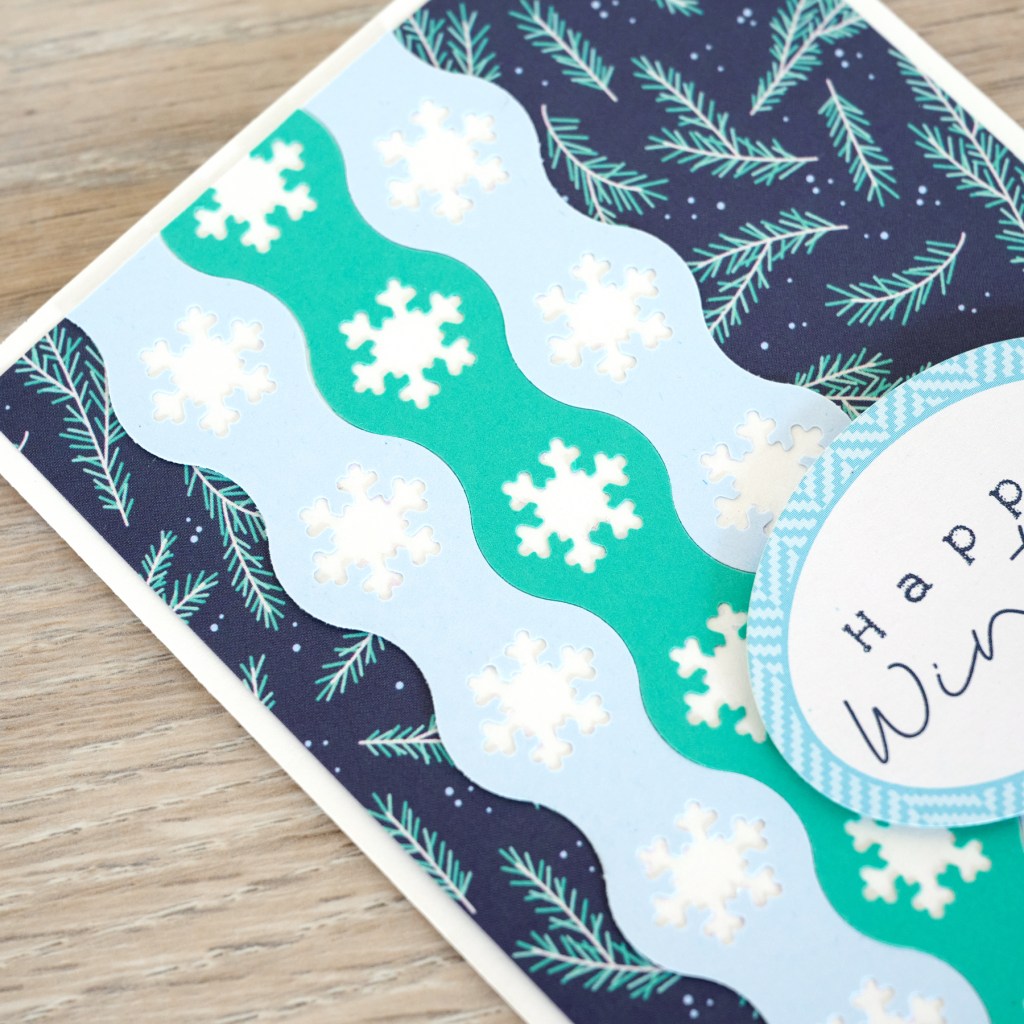 Step 3: Using the Snowflake Circle Chain cartridge, punch a border with both Baby Blue and Island Waters Solid Cardstocks. Cut a 5-1/4””x 2″ piece of White Solid Cardstock. Adhere the borders on the strip as shown, trimming off the excess. Mount on the card.