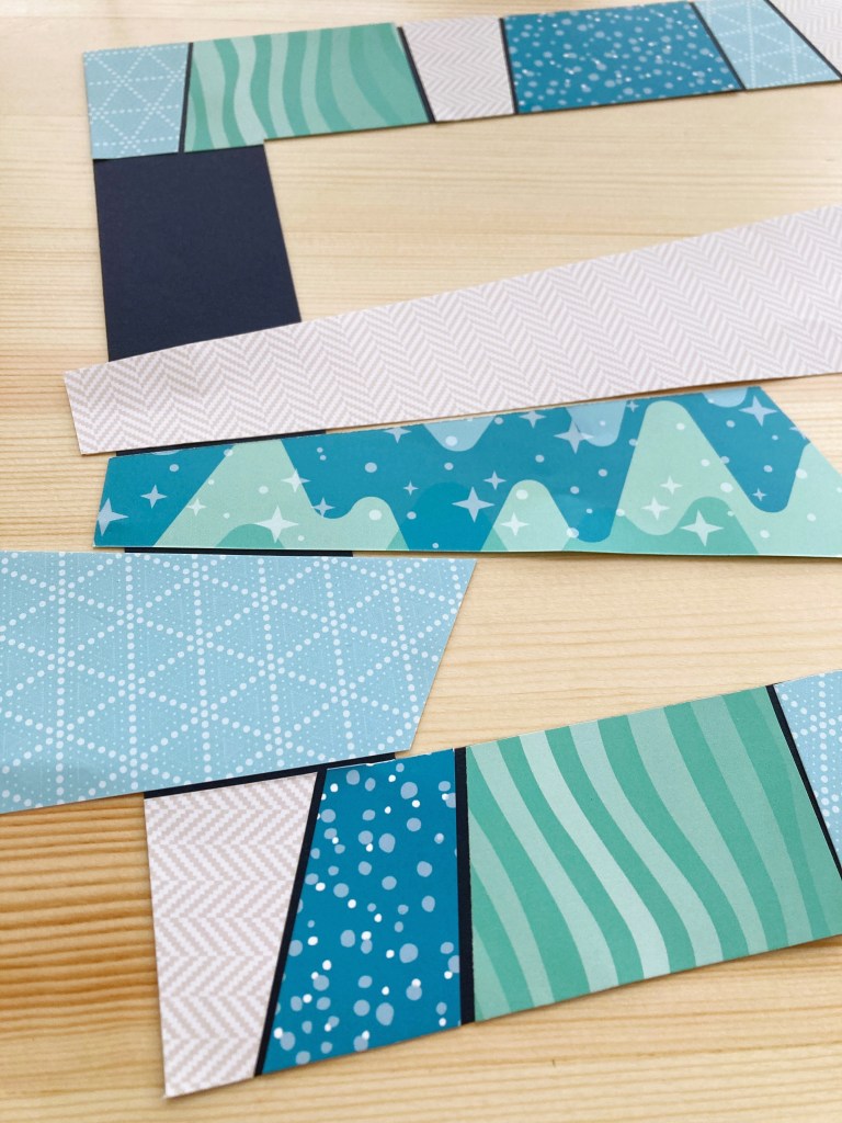 - Adhere the strip to the navy frame, spacing 1/8″ each other as shown. Trim the excess.