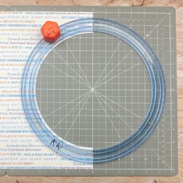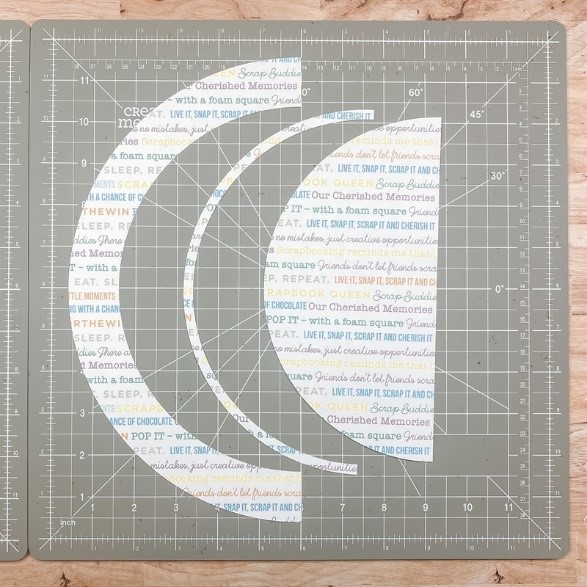 Step 2: Lay the Jumbo Circle Custom Cutting System Pattern on a sheet of scrapbook sayings paper placed on the 13×13 Custom Cutting System Mat (see photo for placement). Cut a half circle, first with the Blue Blade on the inside track of the pattern, then, without moving the pattern, with the Red Blade. Still without moving the pattern, cut a half circle with the Red Blade on the outside track of the pattern. Turn the larger pieces upside down on the 13×13 Custom Cutting System Mat (discarding the narrow middle strip) and align. Tape in place using washi tape. Apply Repositionable Tape Runner adhesive along the middle edges. Cut 1″ x 1/2″ pieces of several various paper scraps. Adhere them along the middle as shown. Adhere the half-circle on the left-half of the layout.